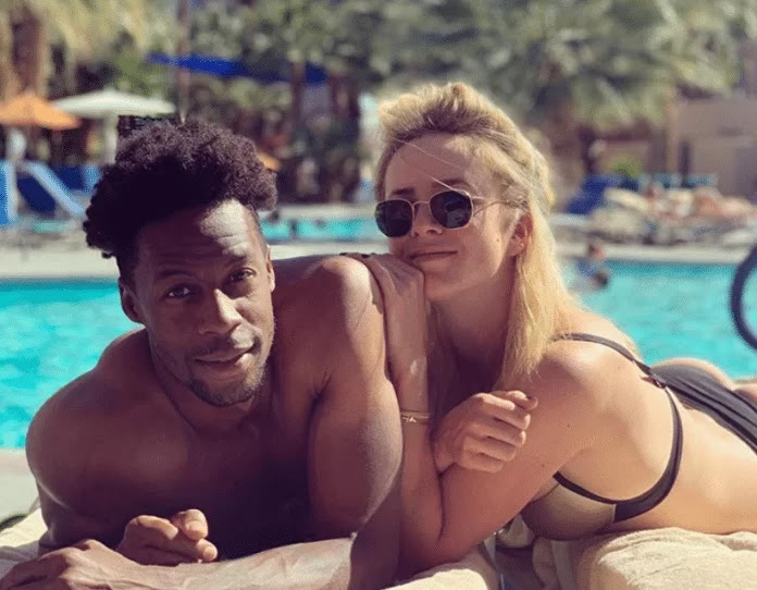 * Svitolina is dancing to "Feels Good" by Tony Toni Tone at her wedding. on a makeshift collection of clear glass silver squares platform on top of the lobby carpet of the Sheraton. Monfils's groom dress is purple.